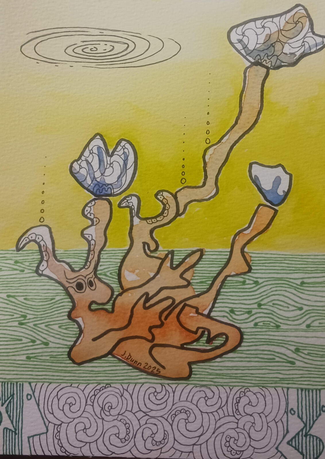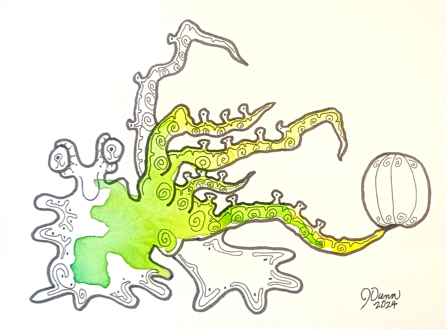 These are Rorschachian watercolor blots that I turn into strange characters.